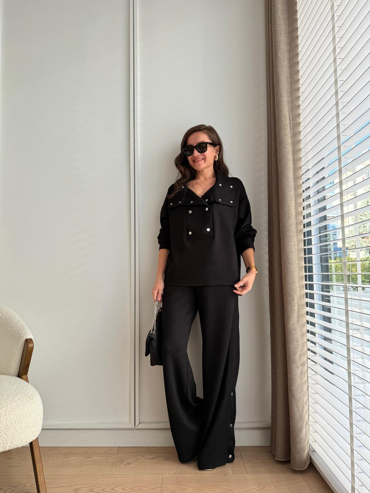 Siyah Çıtçıt Düğmeli Paça Detaylı Modal Takım 36704
