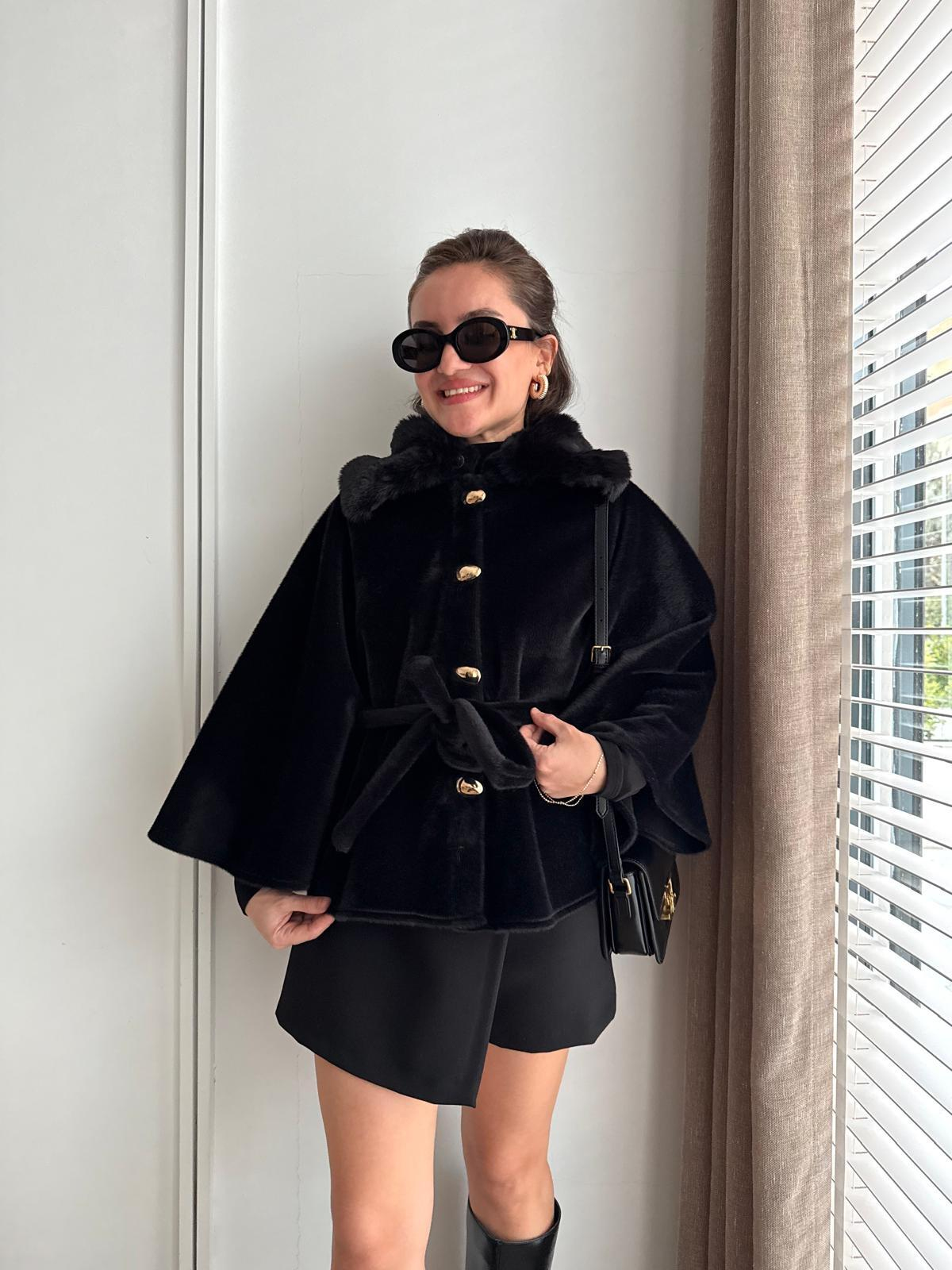 Siyah Gold Düğmeli Yakası Kürklü Kuşaklı Panço 2408