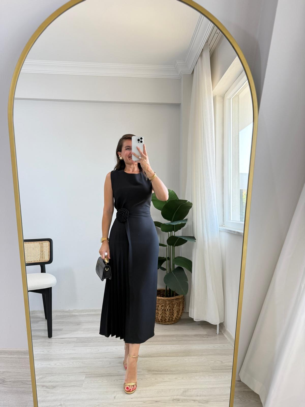 Siyah Gül Broşlu Yan Pile Detaylı Elbise 251671