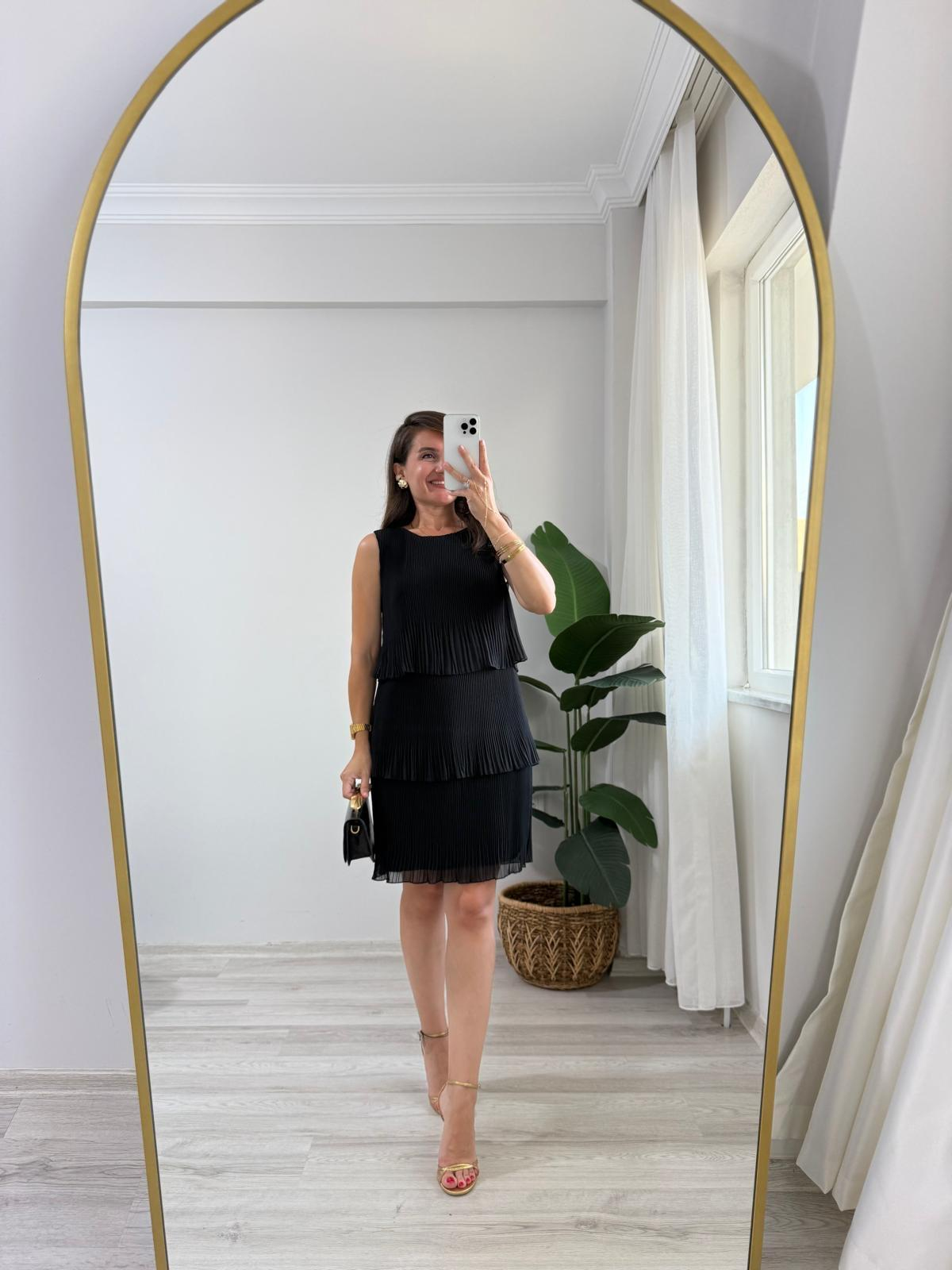 Siyah İnce Piliseli Katlı Şifon Elbise 2627