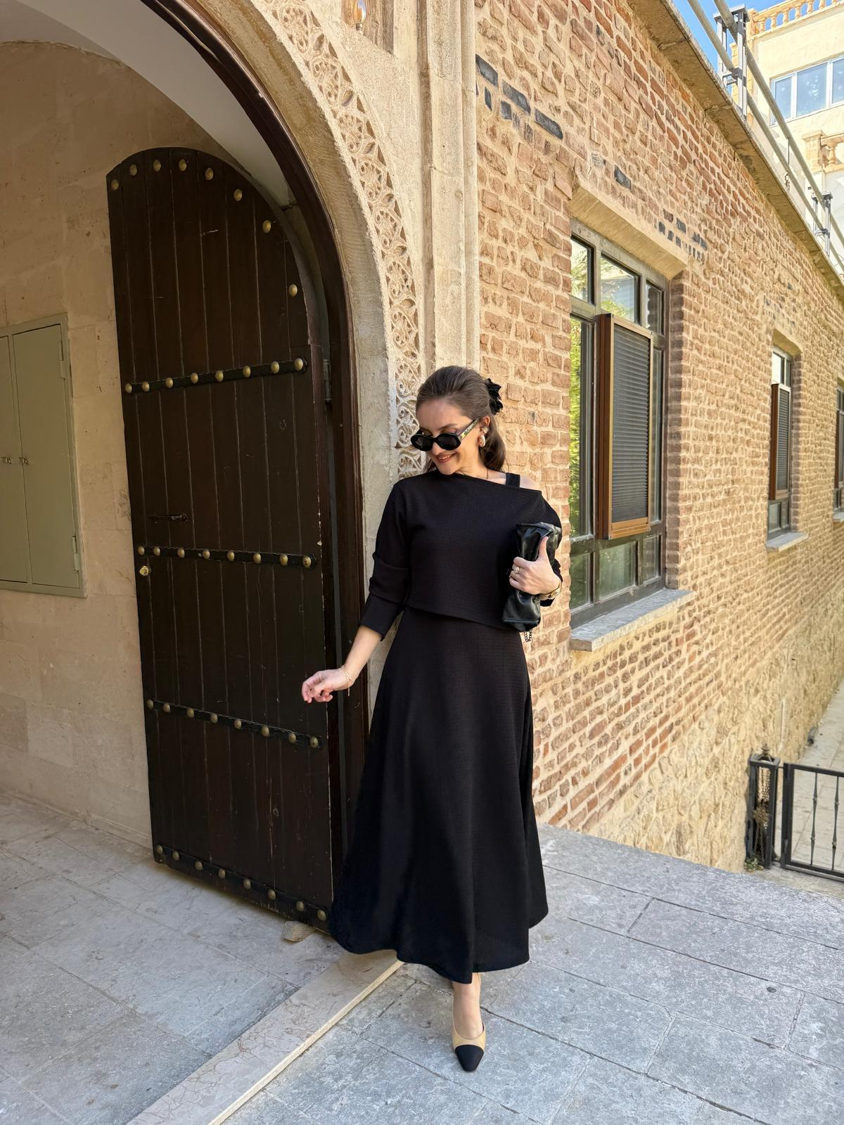 Siyah Kalın Askılı Kloş Elbise Bluz Takım 7634