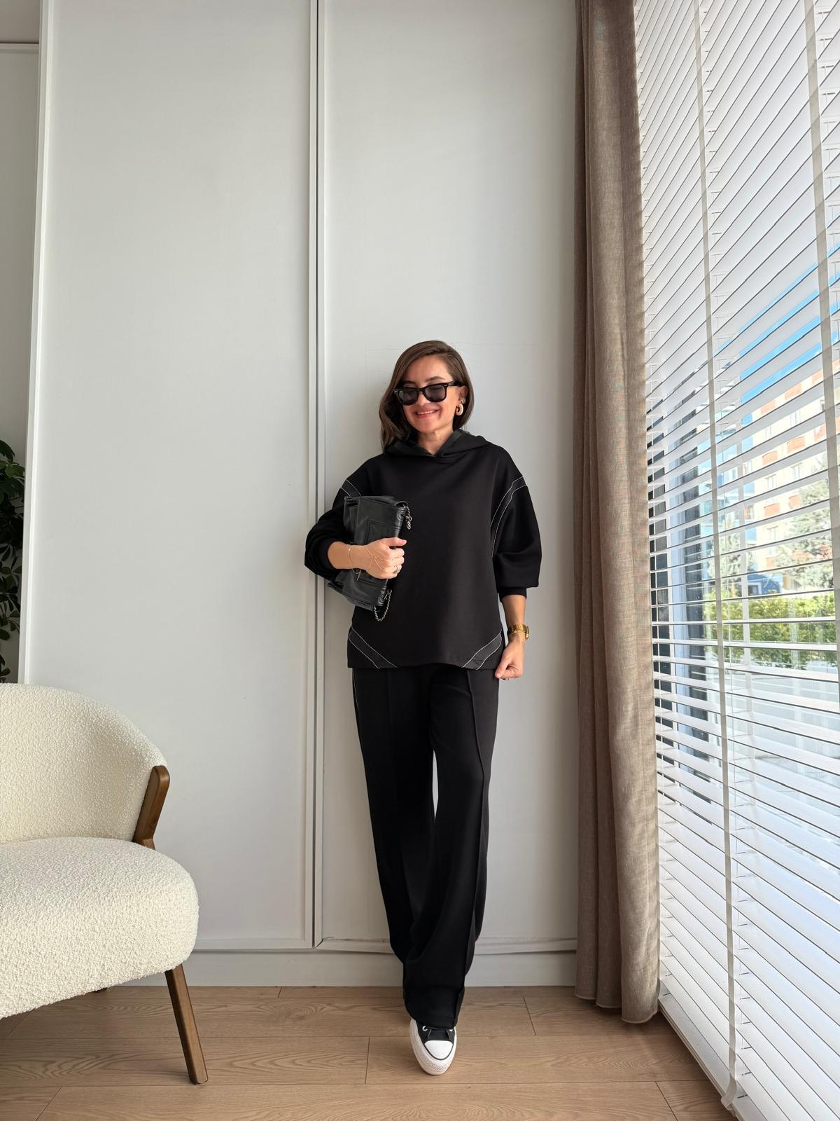 Siyah Kapüşonlu Taş Detaylı Modal Takım 2573