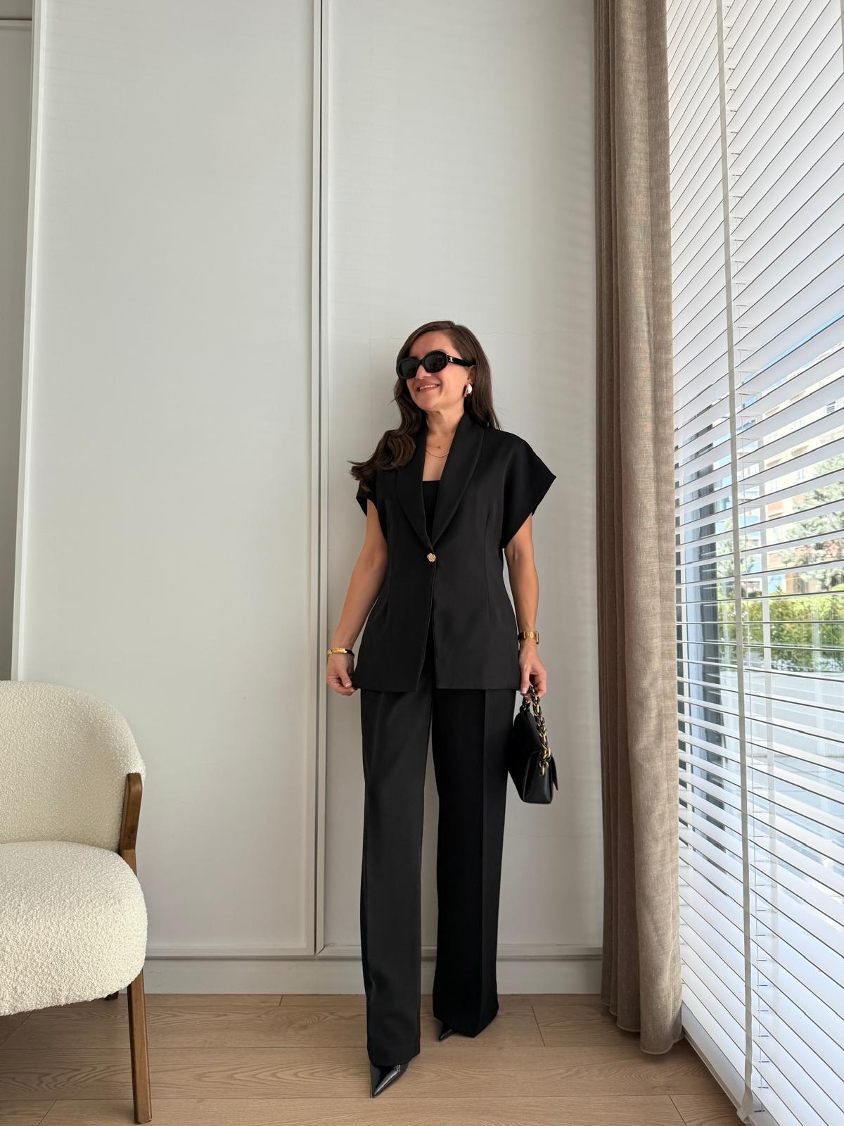 Siyah Kruvaze Yaka Gold Düğmeli Yelek Pantolon Takım 8789