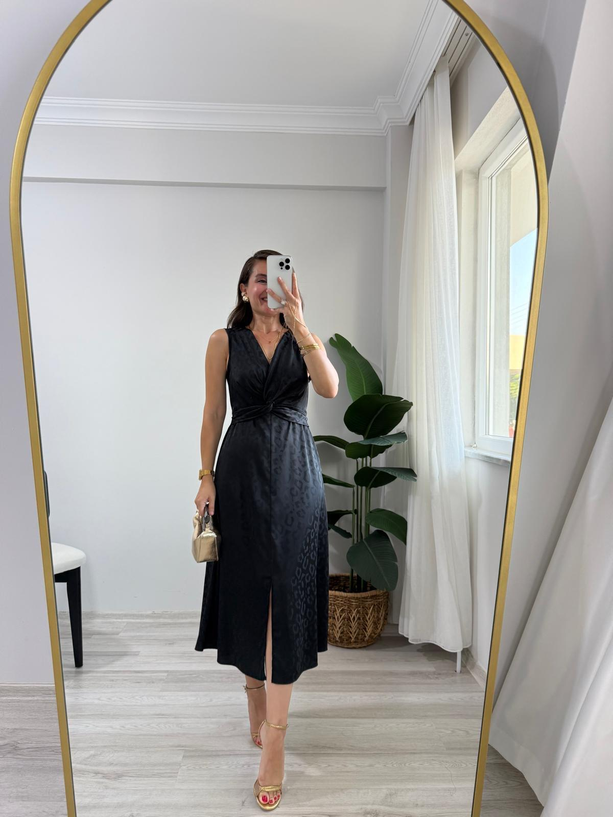 Siyah Leopar Desenli Ön Düğüm Detaylı Midi Boy Elbise 2634