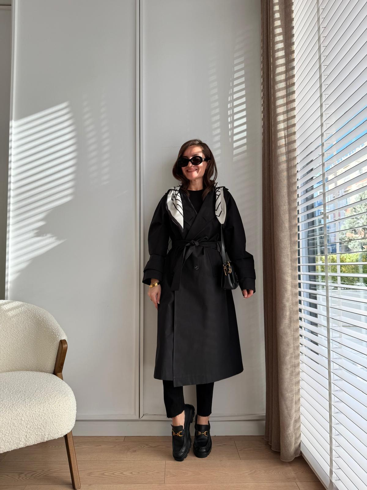 Siyah Lüx Kalite Fularlı Uzun Trençkot 7535