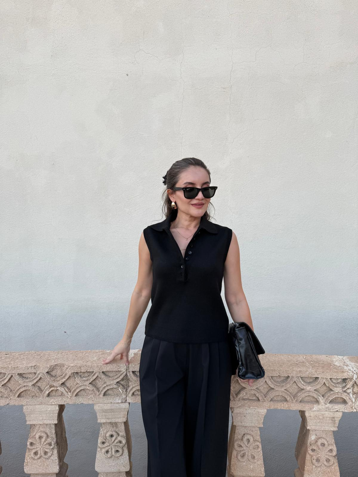 Siyah Polo Yaka Düğmeli Triko Kazak 251105