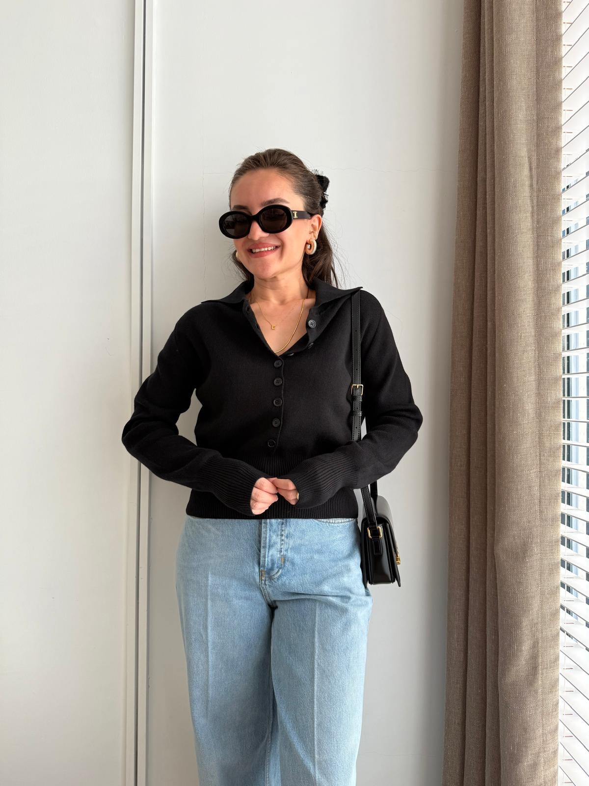 Siyah Polo Yaka Düğmeli Triko Kazak 10816