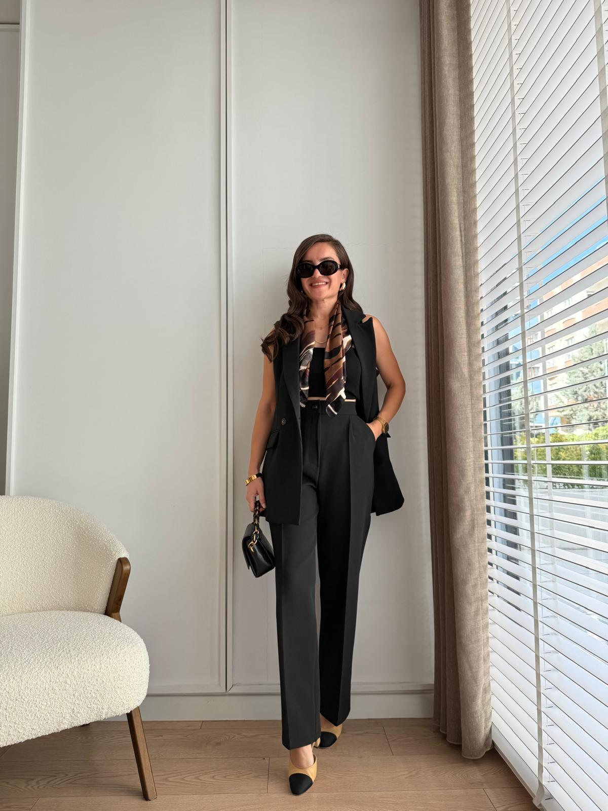 Siyah Premıum Seri Kruvaze Yaka Düğmeli Yelek Pantolon Takım 8775