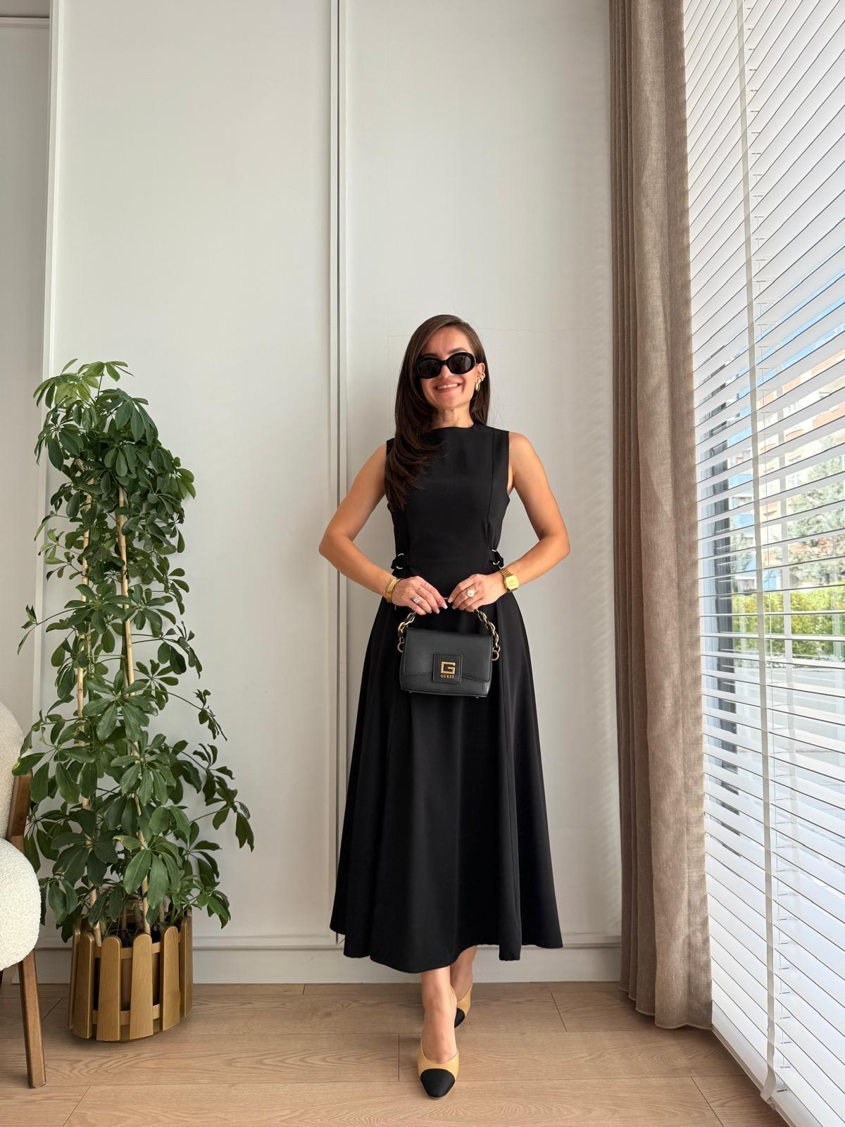 Siyah Sıfır Kol Kendinden Kemerli Kloş Elbise 2313
