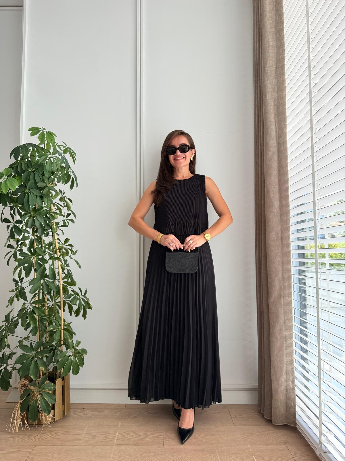 Siyah Sıfır Kol Piliseli Şifon Elbise 2621