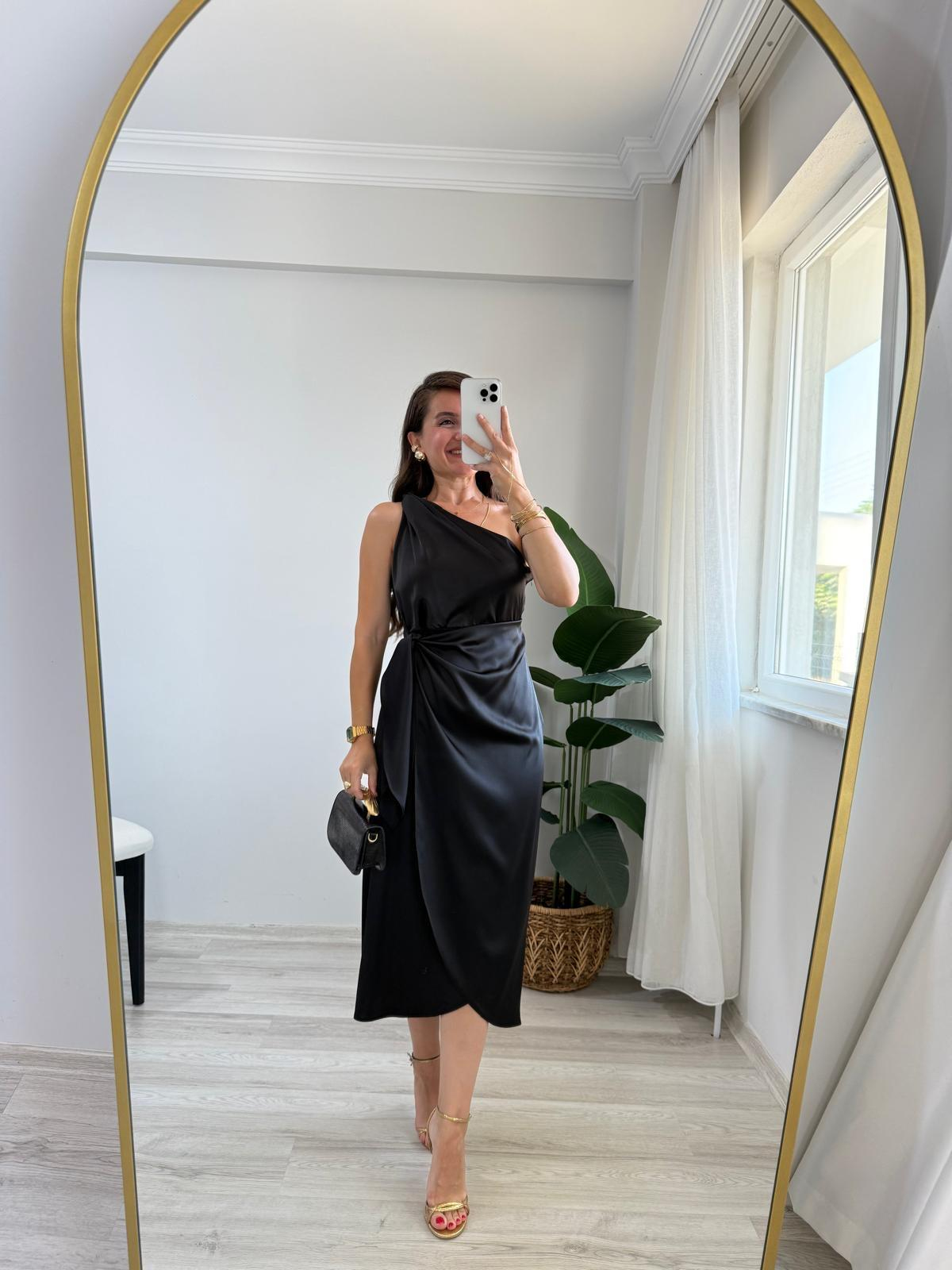 Siyah Tek Omuz Bağlama Detaylı Saten Elbise 2120