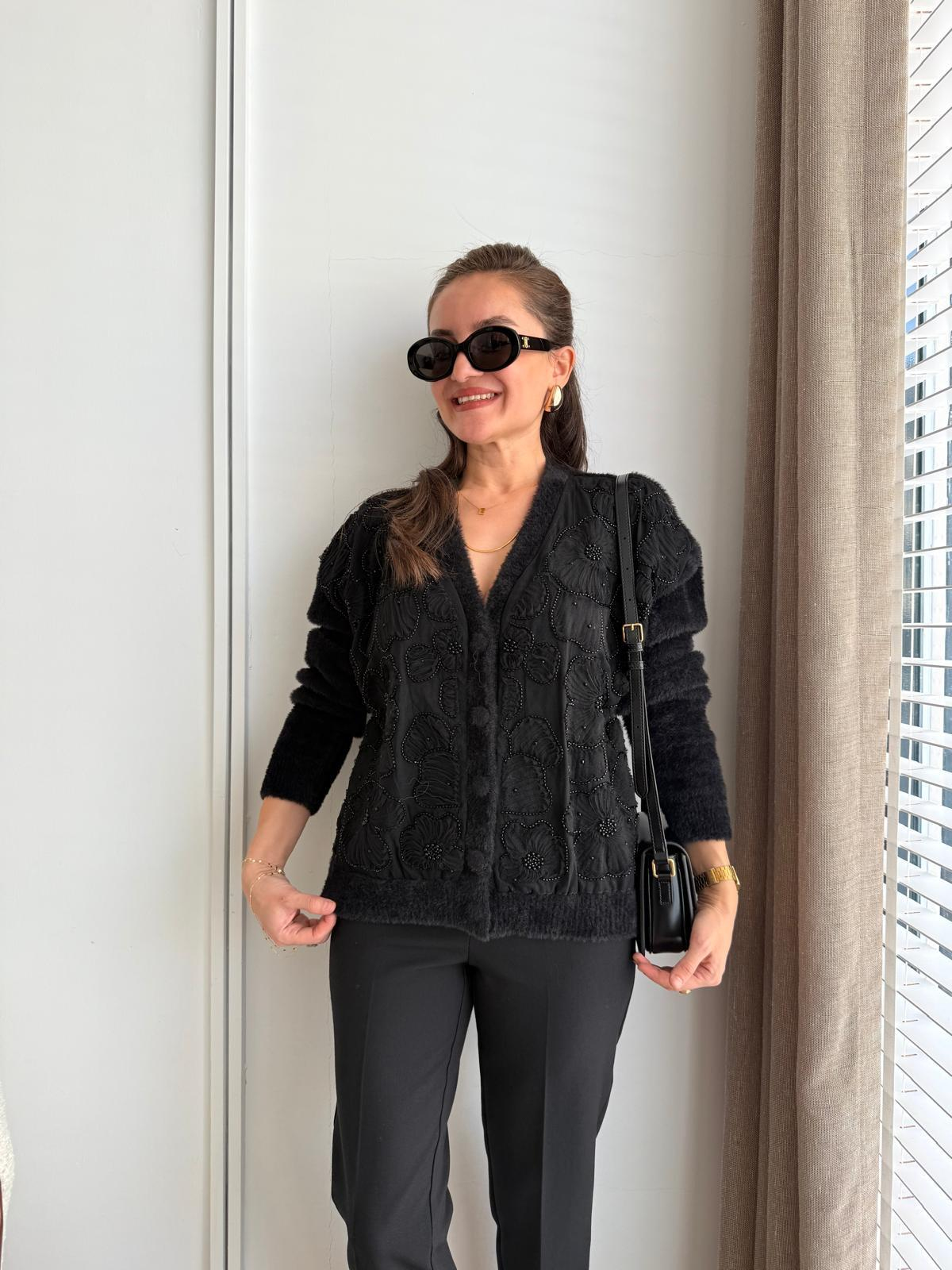 Siyah V Yaka Kabartma Çiçek Detaylı Hırka 70448