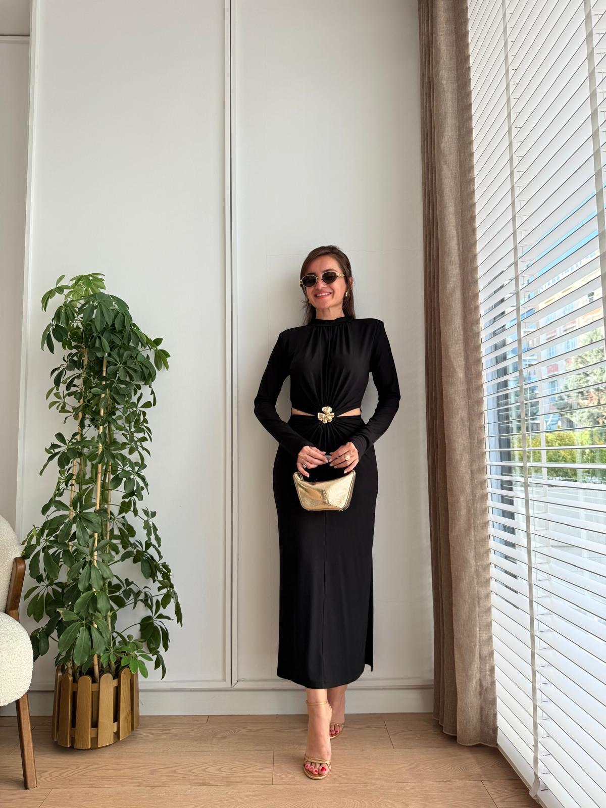 Siyah Vatkalı Bel Dekolte Detaylı Broşlu Elbise 9128