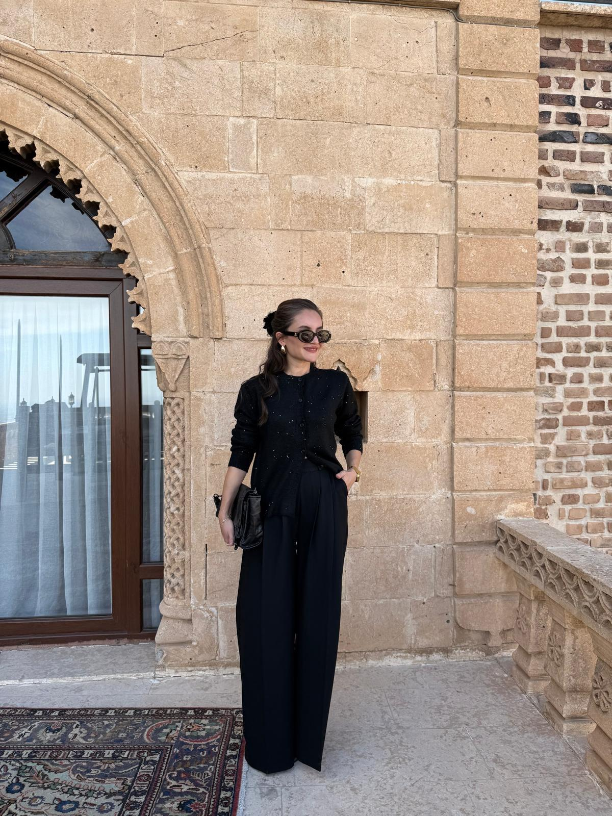 Siyah Yüksek Bel Pile Detaylı Palazzo Pantolon 251015