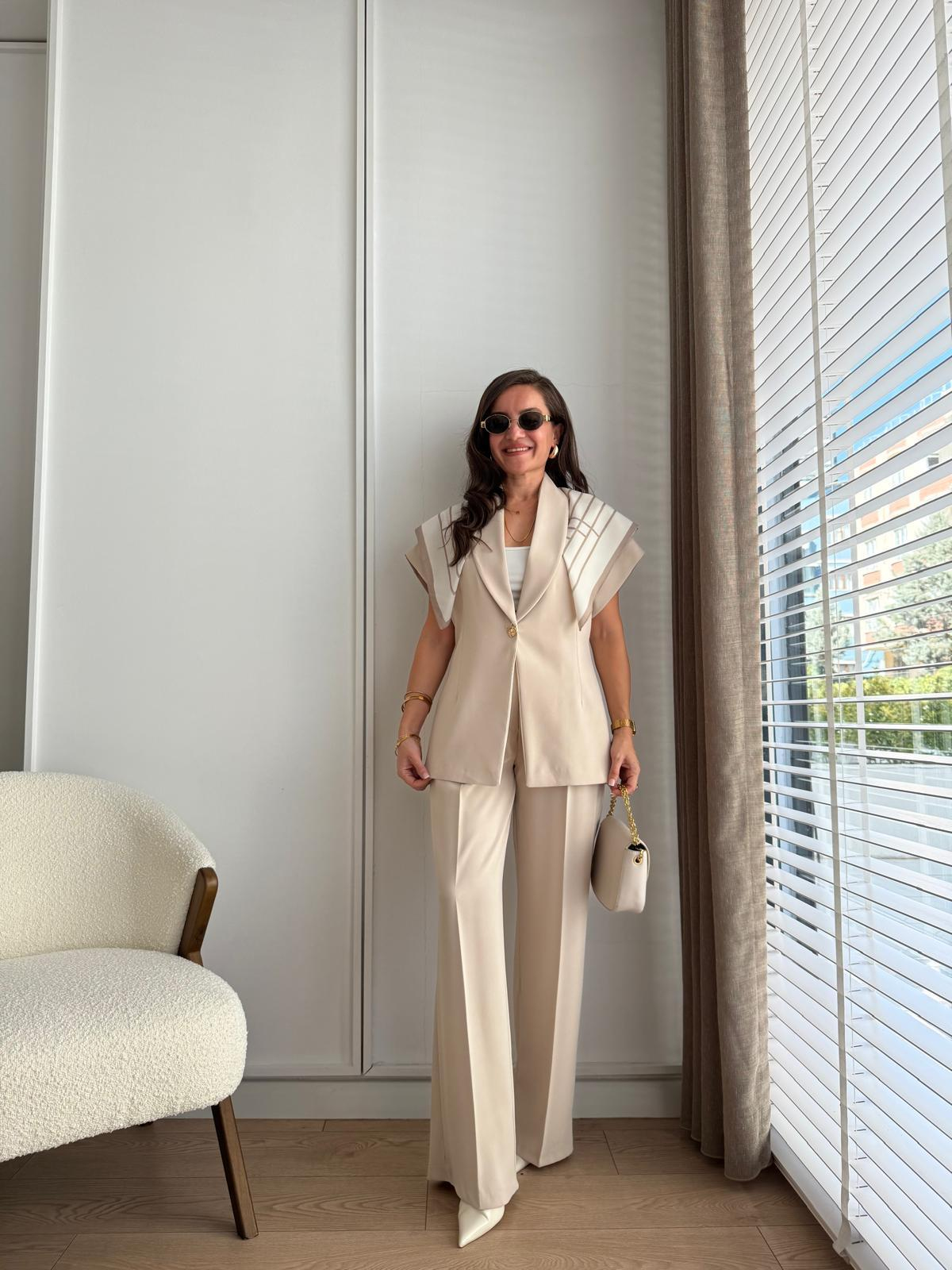 Taş Kruvaze Yaka Gold Düğmeli Yelek Pantolon Takım 8789