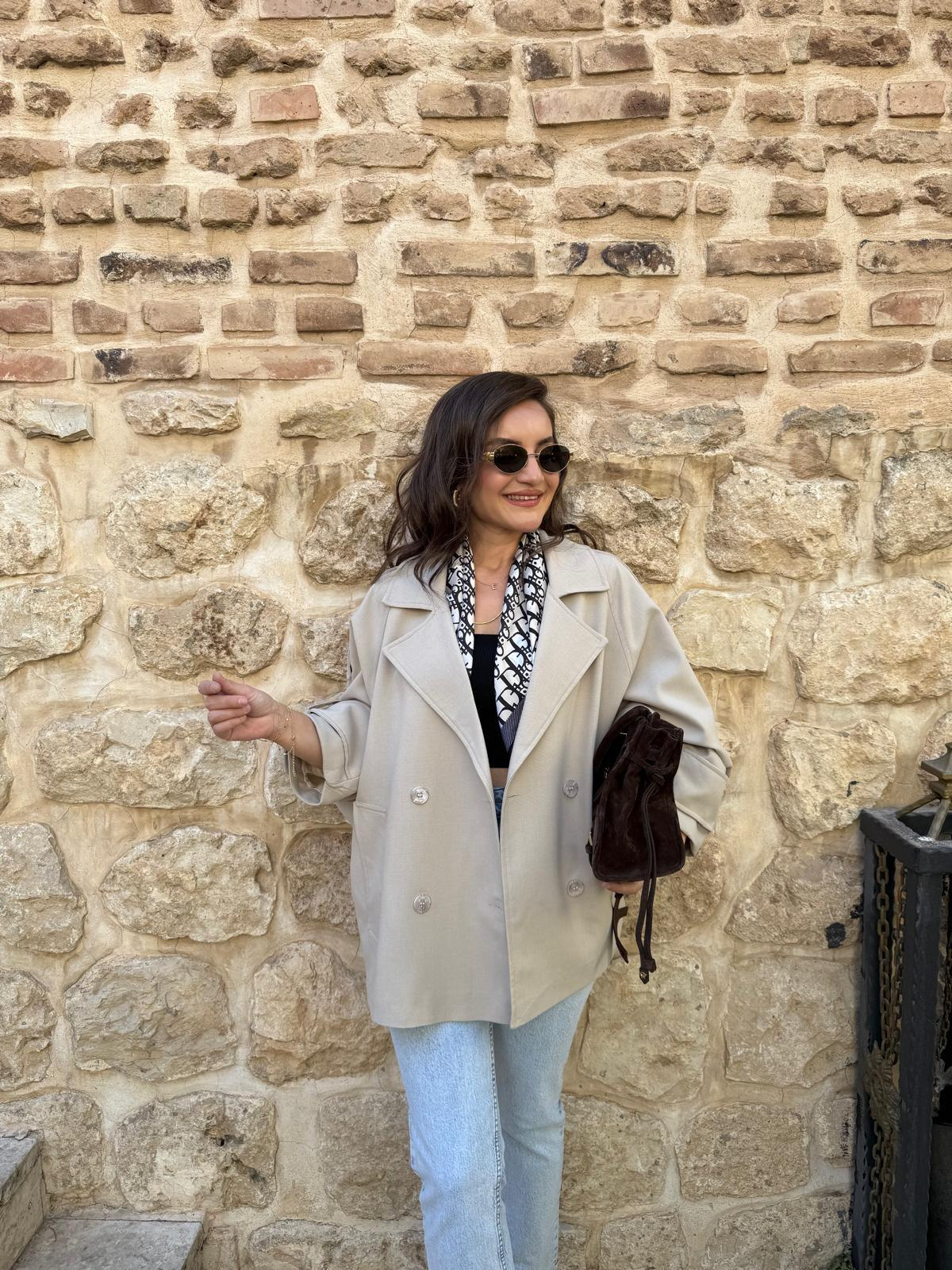 Taş Kruvaze Yaka Kol Detaylı Kısa Trençkot 7537