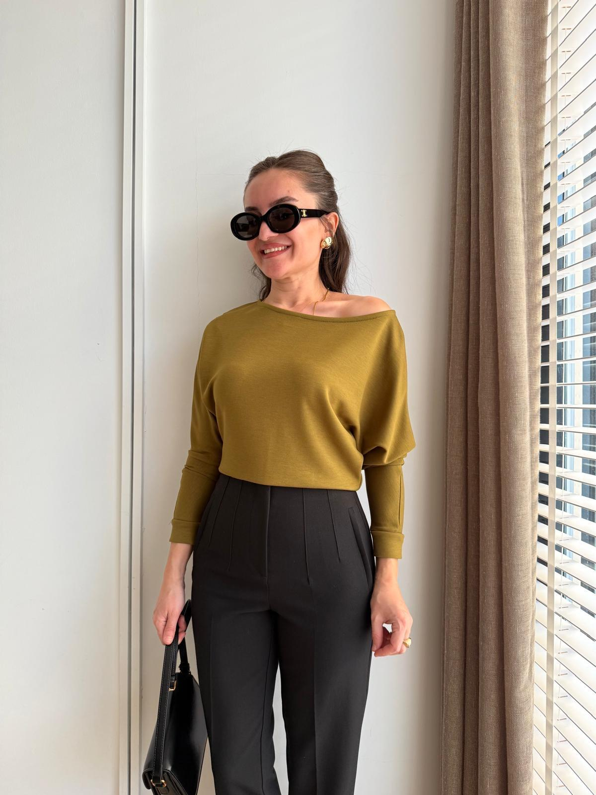 Yağyeşili Kayık Yaka Yarasa Kol Bluz 1514