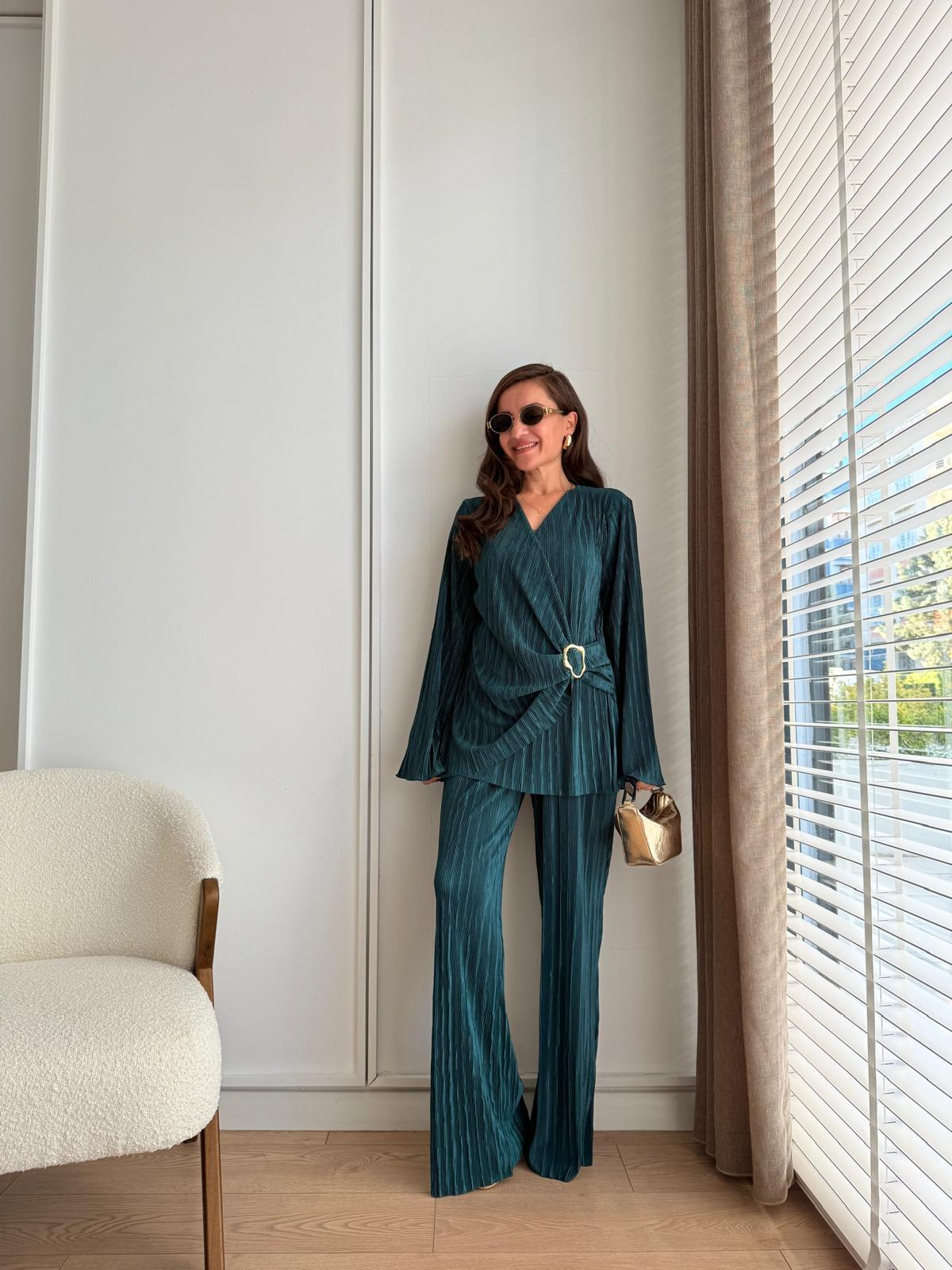 Zümrütyeşili Akordiyon Kumaş Bel Toka Detaylı Bluz Pantolon Takım 9181